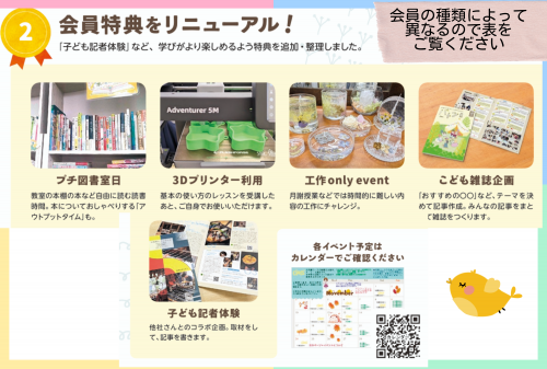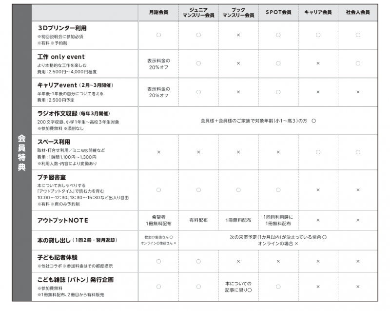「3Dプリンターの時間利用」「子ども記者体験」「子どもたちの作成した記事を集めた『子ども雑誌バトン』の発行」など、学びがより楽しめるよう、会員特典を追加&整理しました!