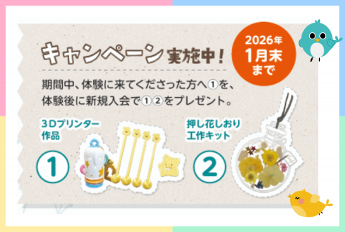 キャンペーン期間(2025年11月1日~2026年1月末日予定)この3か月間に、体験にきてくださった方へ①を、体験後いずれかの会員に新規で入会くださった方へ①②をプレゼント。