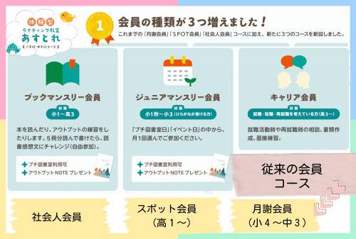 「本をたのしむ」「本をじっくり読めるようになる」そんな『ブックマンスリー会員』コースをスタート。「プチ図書室日」を毎月4日もうけ、「アウトプットNOTE」を活用しながらすすめていきます。
